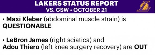 NBA焦點(diǎn)揭幕戰(zhàn),湖人將在10月22日主場(chǎng)對(duì)陣勇士,如今湖人官方發(fā)布球隊(duì)揭幕戰(zhàn)傷病報(bào)告,詹姆斯與新秀阿杜-蒂耶羅因傷缺席,克勒貝爾出戰(zhàn)成疑。至于勇士方面,穆迪因?yàn)樾⊥葌麆?shì)缺席,科爾表示巴特勒與庫(kù)明加預(yù)計(jì)均能出戰(zhàn)。